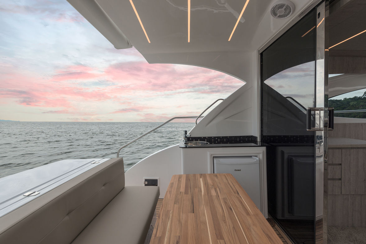 A área de popa impressiona por sua amplitude e espaço gourmet equipado, garantindo que sua festa a bordo seja inesquecível.